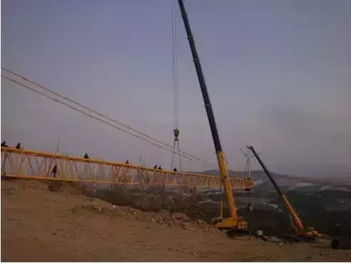 此机位平台长度不够,通完平台道路坡度较大,捅死道路通往平台处有一较大转弯(坚石阻断),故采用此方式进行起重臂组合。