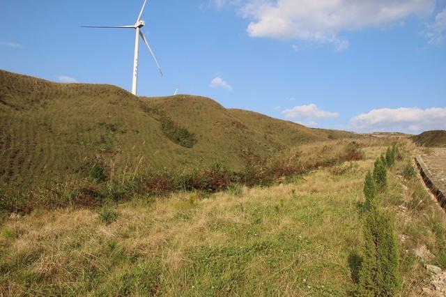 在龙里风电场内,记者发现环水保工程常见的网格梁护坡、挡土墙等水泥硬化措施并不多见,而是以植物恢复为主,尤其风场道路两旁整齐排列、间隔栽种的松柏、水冬瓜木等小树苗非常醒目,尤为特别。