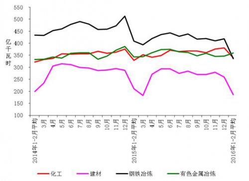 1-2月份,化学原料制品、非金属矿物制品、黑色金属冶炼和有色金属冶炼四大高载能行业用电量合计2441亿千瓦时,同比下降10.1%,增速同比回落10.6个百分点;合计用电量占全社会用电量的比重为27.9%,对全社会用电量增长的贡献率为-159.3%。其中,化工行业用电量679亿千瓦时,同比增长3.3%,增速比上年同期提高0.7个百分点;建材行业用电量372亿千瓦时,同比下降12.0%,增速比上年同期回落17.8个百分点;黑色金属冶炼行业用电量671亿千瓦时,同比下降18.0%,增速比上年同期回落12.4个百分点;有色金属冶炼行业719亿千瓦时,同比下降11.8%,增速比上年同期回落15.3个百分点。