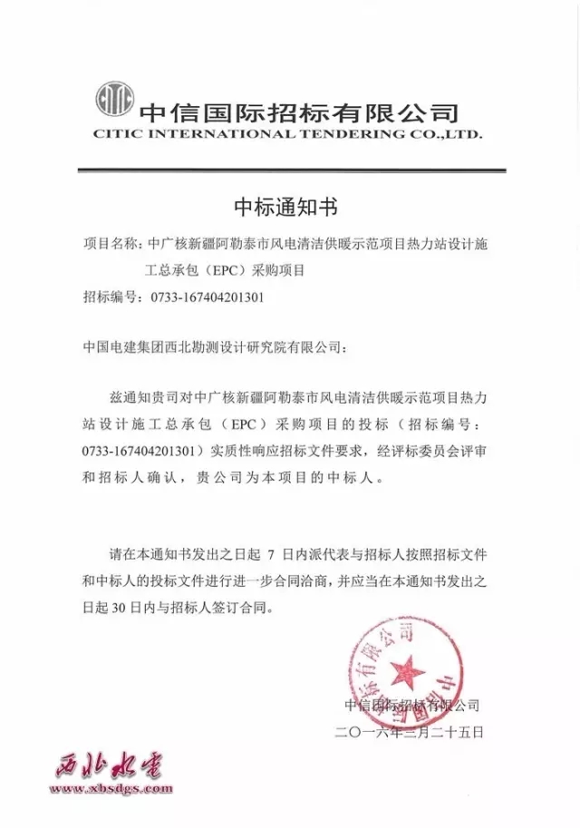 3月25日,西北水电公司收到招标代理机构发来的中标通知书,宣布西北水电中标中广核新疆阿勒泰市风电清洁供暖示范项目热力站设计施工总承包(EPC)采购项目。