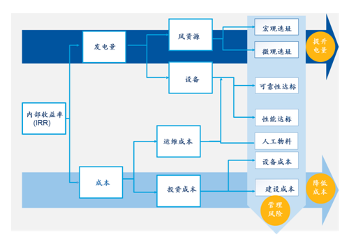 所以,行业领先的风电场专业开发商要用“风电场开发解决方案招标”来应对风电场开发投资收益上的风险和脆弱。下面这幅“风电场收益模型影响因素”图有助于你理解这个问题,它说明传统割裂的“铁路警察各管一段”的开发模式正在被越来越多的专业风电开发商所摒弃。