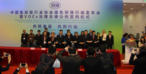会展首日,嘉宾云集,活动多多。上午十时五十分,为主动配合中国环保政策的贯彻实施,尽快实现集装箱行业VOCs大幅减排,保持行业持续健康发展,由中国集装箱行业协会发起,环保部门、行业协会代表,集装箱制造商,涂料供应商,集装箱用户及科技服务机构代表等一起到场,鉴证了中国集装箱协会绿色环保行动发布会暨VOCS治理自律公约签约仪式。