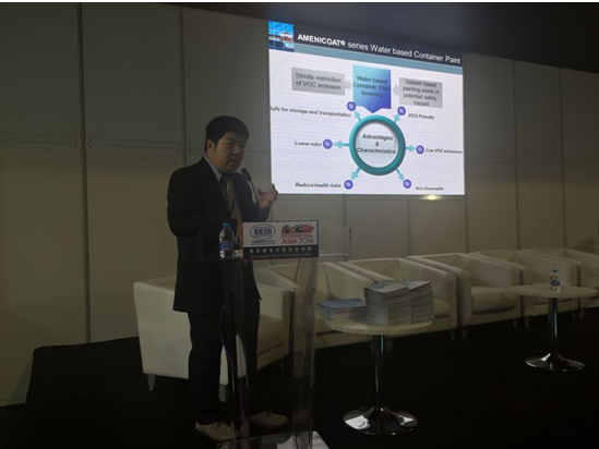 作为集装箱行业协会资深理事单位、绿色环保涂料的倡导者和推动者,中远关西销售总监秦国伟先生参加了签约仪式。下午,我司技术中心程煜博士受邀在技术论坛做了题为“Amenicoat @series waterborne container" 报告,全程用英文向与会嘉宾介绍了中远关西水性集装箱涂料的技术及应用情况。