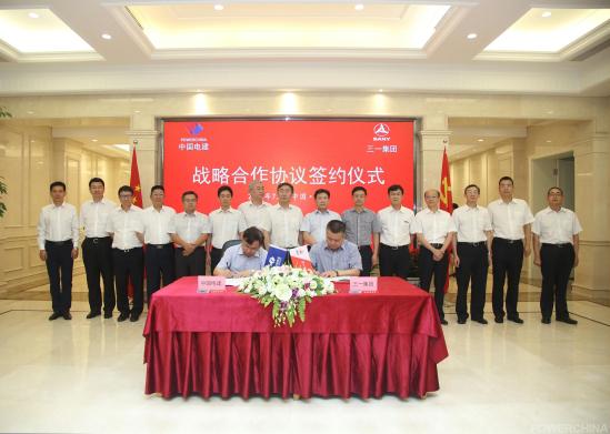 7月14日下午,中国电建与三一集团在北京签订战略合作协议。中国电建集团暨股份公司董事长晏志勇,三一集团董事长梁稳根出席签字仪式。中国电建副总经理李跃平和三一集团高级副总裁毛中吾代表双方在协议书上签字。