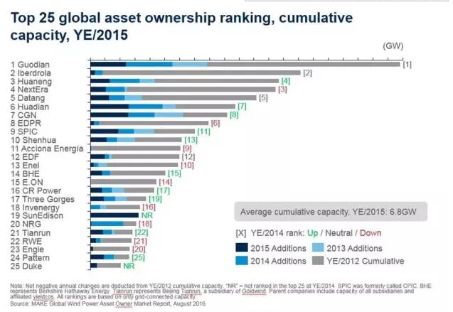 总的来说,截止到2015年底,排名前25的风电业主拥有1.7亿kW的并网装机容量,占到全球全部并网装机容量的41%。