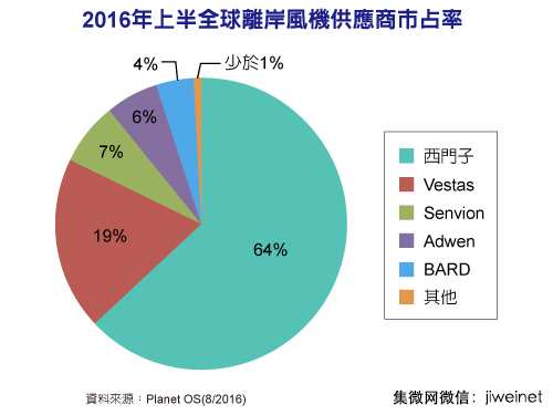 全球离岸风力发电迎来新一波发展热潮。据研究机构Planet OS统计,2016年上半全球离岸风力发电容量比2015年增加4.2%,总发电容量达到12,672百万瓦(MW)。值得注意的是,2016年上半新增的114个并网型风力发电机组全部都由西门子(Siemens)拿下。也由于西门子在2016年上半大获全胜,拿下全球所有并网型离岸风机市场,其全球累积市占率进一步拉高到64%,与排名第二的Vestas差距拉大。其他主要风机供应商还有Senvion、Adwen等业者。