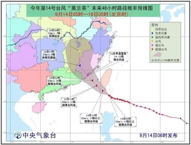 大风预报:14日08时至15日08时,南海东北部、巴士海峡、台湾以东洋面、台湾海峡、台湾沿海、福建沿海、浙江南部沿海、东海西部和南部将有7~10级大风,部分海域和地区风力有11~12级,“莫兰蒂”中心经过的附近海域和地区风力可达13~17级以上。