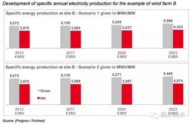 在风力发电机更新换代的初期,离岸风力机的发电效率并不会有明显的改善,因为还需要针对实际环境做许多调整。由于风力发电场本身也要用电,以及海底电缆的损耗等因素,离岸风机的毛发电量通常比净发电量(扣除用电、耗损与其他因素)高出许多。平均来说,德国风场的净容量因素(Net Capacity Factor)约在45-48%之间。净发电量通常是毛发电量的75-78%。我们一般计算风力发电成本的时候,使用净发电量来估计。