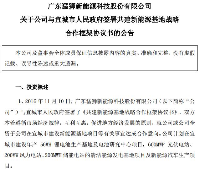 11月12日,参与起草锂离子动力电池国家标准的广东猛狮新能源科技股份有限公司发布公告,投入30亿元用20个月时间在宜城市建成年产500万千瓦时锂电池生产基地和新一代电池研发中心。未来5年内,还将投入58亿元,分批分期建设光伏发电、风力发电和储能电站。
