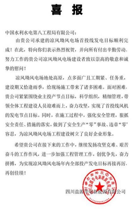11月16日上午,水电八局承建的四川盐源凉风坳风电场B回线实现首投发电目标,业主四川盐源华电新能源有限公司发来喜报。