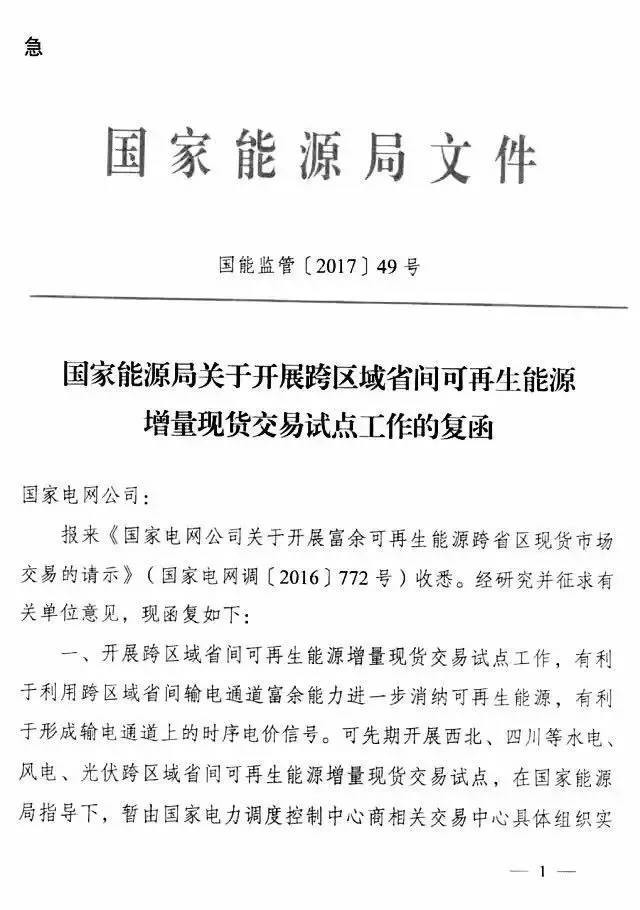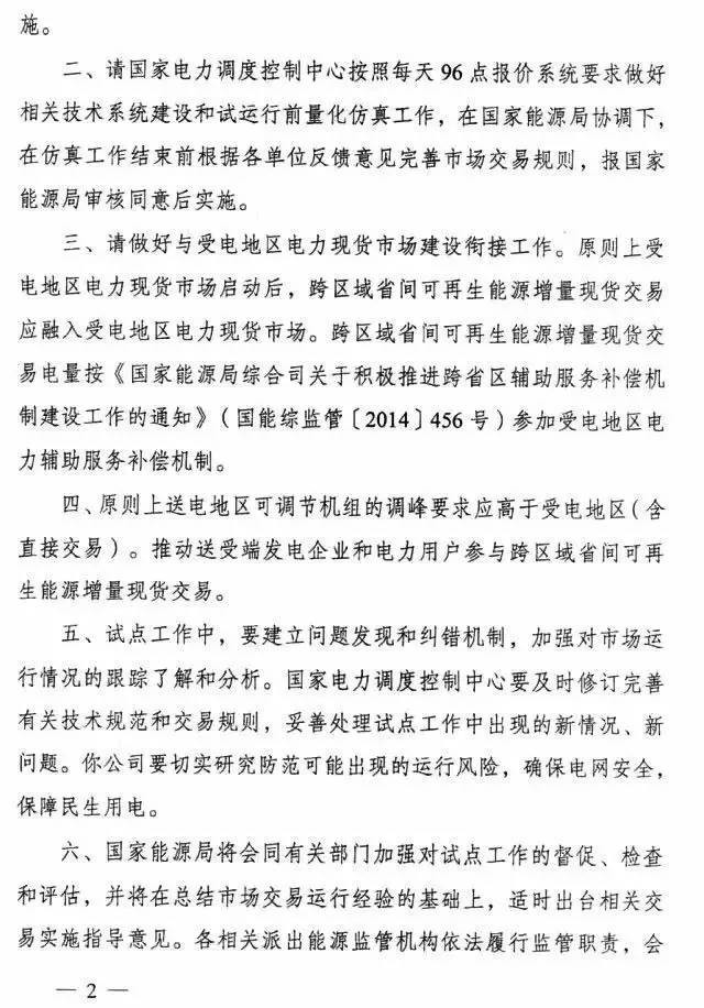 国家能源局2月14日发布《国家能源局关于开展跨区域省间可再生能源增量现货交易试点工作的复函》,复函同意开展可再生能源增量现货交易试点,先期开展西北、四川等水电、风电、光伏跨区域省间可再生能源增量现货交易试点。以下为复函原文: