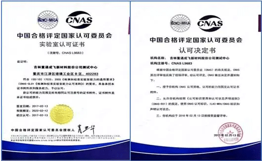 近日,吉林重通成飞新材料股份公司测试中心通过了中国合格评定国家认可委员会(CNAS)审核,被确认为国家认可试验室。