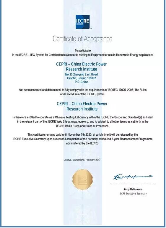 3月3日,从国际电工委员会可再生能源委员会(IEC RE)获悉,中国电科院正式获得IEC RE颁发的国际电工委员会认可实验室证书,成为亚洲首家获得IEC RE认可的测试机构(RETL)。标志着中国电科院在风电试验检测能力方面的国际认可度由国际知名机构内的互认可扩展至IEC标准体系内的互认可,跻身世界一流的行列。