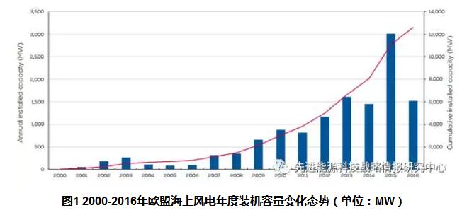 2016年欧洲新增并网海上风电分布在德国、荷兰和英国。德国装机量占到一半以上(155台,813 MW,占比52.1%),荷兰次之(177台,691 MW,占比44.3%),第三大市场是英国(7台,56 MW,占比3.6%)。主要风力涡轮机制造商是西门子(337台,1511 MW,96.4%),其次是三菱重工维斯塔斯(7台,56 MW,3.6%)。由于2016年首台8 MW涡轮机已在海上并网,欧洲海上风力涡轮机平均容量从2015年的4.2MW提高到4.8 MW,并网海上风电场平均规模为379.5MW,相比2015年增加了12.3%。2016年海上风力发电场的平均水深从2015年的27.2 m增加到29.2 m,平均离岸距离为43.5km,比2015年增加了0.2 km。