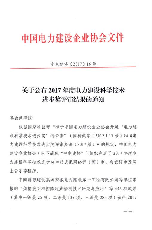 中国能源建设集团安徽电力建设第一工程有限公司等单位申报的“角接接头相控阵超声检测技术研究与应用”等446项成果(其中一等奖25项、二等奖135项、三等奖286项)获得2017年度电力建设科学技术进步奖,现将评审结果予以公布(评审结果名单见附件)。