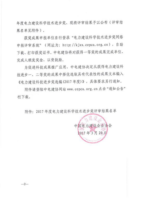 关于公布2017年度电力建设科学技术