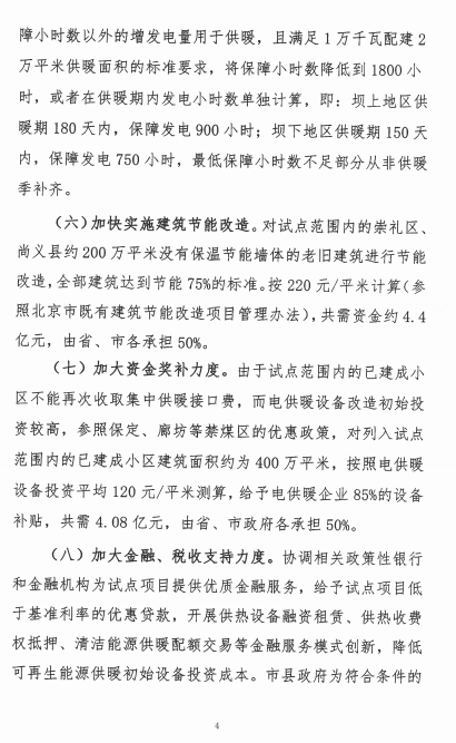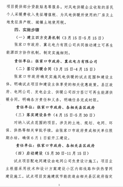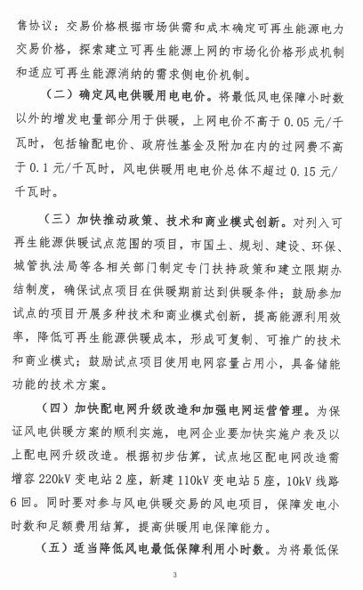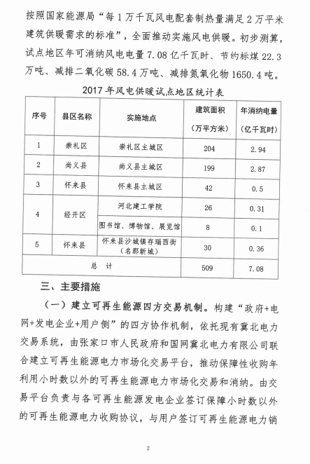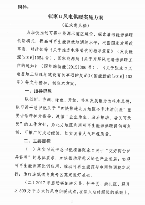 河北张家口发改委近日发布关于征求《张家口风电供暖实施方案》意见的函。方案指出,2017年启动实施尚义县、怀来县、崇礼区、经开区509万平方米的风电供暖试点,在深入总结经验的基础上按照国家能源局“每1万千瓦风电配套制热量满足2万平米建筑供暖需求的标准”,全面推动实施风电供暖。初步测算,试点地区年可消纳风电电量7.08亿千瓦时。将最低风电保障小时数以外的增发电量部分用于供暖,上网电价不高于0.05元/千瓦时,包括输配电价、政府性基金及附加在内的过网费不高于0.1元/千瓦时,风电供暖用电电价总体不超过0.15元/千瓦时。以下为征求意见函及实施方案原文: