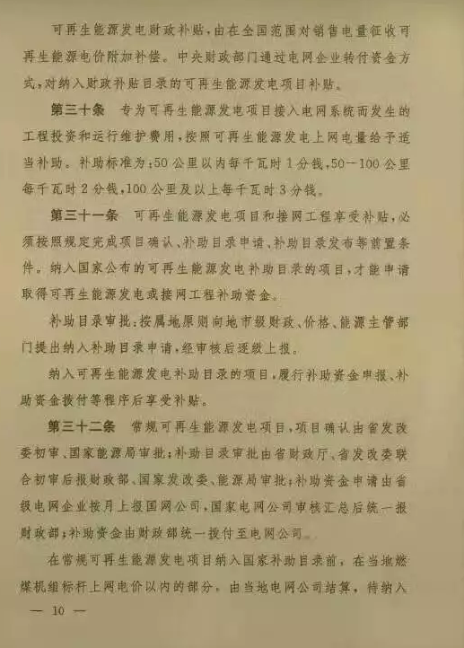 3.专为可再生能源发电项目接入电网系统而发生的工程投资和运行维护费用,按照可再生能源发电上网电量给予适当补助。补助标准为50公里以内每千瓦时1分钱,50-100公里每千瓦时2分钱,100公里及以上每千瓦时3分钱。