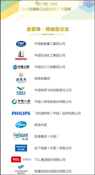 自2007年以来,“金蜜蜂企业社会责任·中国榜”每年发布一次,分别评出领袖型企业奖、成长型企业奖、长青奖等七类奖项。今年共有600多家企业参与活动评选,包括金风科技、中国石化、中国长江三峡、TCL集团在内的12家企业脱颖而出,荣膺“领袖型企业奖”表彰。