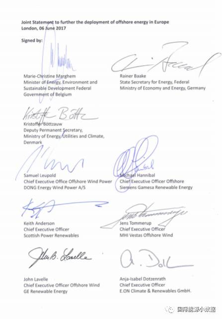 2017年6月6日,德国、丹麦、比利时能源部长与25家能源企业签署共同声明,在未来10年内推动海上风电的大发展,目标是把欧洲海上风电装机从现在的13.8吉瓦增加到60吉瓦,到2030年以前海上风电成本将可与天然气发电竞争。