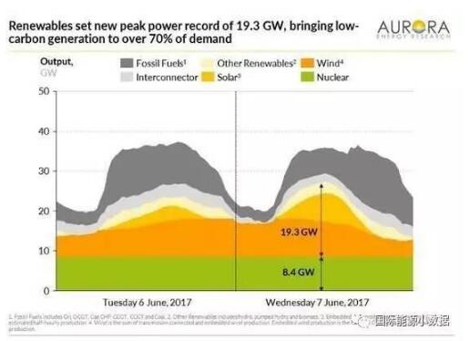 2017年6月7日下午1时,英国可再生能源发电出力达到创纪录的19.3吉瓦(其中风电9.5吉瓦、太阳能7.3吉瓦),满足50.7%的电力负荷;而同时核电出力8.4吉瓦、天然气电厂7.2吉瓦,当时没有煤电厂运行。值得注意的是,从6月6日-7日的电源结构来看,核电一直稳定在8.4吉瓦,而风电也成为核电之后满足基荷的电源,煤电厂成了时有时无的调峰电源。