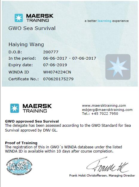 根据国家能源局印发的《风电发展“十三五”规划》,到2020年底,风电累计并网装机容量应确保达到2.1亿千瓦以上,其中海上风电并网装机容量达到500万千瓦以上。由此可见,未来将有大量人员需要接受专业的海上培训。海上作业属于高危行业,必须保障海上风电从业人员的安全,但国内现有的安全培训模拟环境单一固定,无法满足风电不断发展的趋势。为保障海上风电场生产运营过程中的人身安全,引入切实可行的安全培训标准势在必行。而GWO具有丰富的风电行业经验和海上风电专业培训资质,引入GWO基本安全培训将有利于降低出海风险、有利于提高海上项目工作效率。因此,风电集团安全管理人员通过GWO“基本安全培训”将会引领国内海上安全培训的新方向,并推动今后上海电气海上风电安全能力的建设。