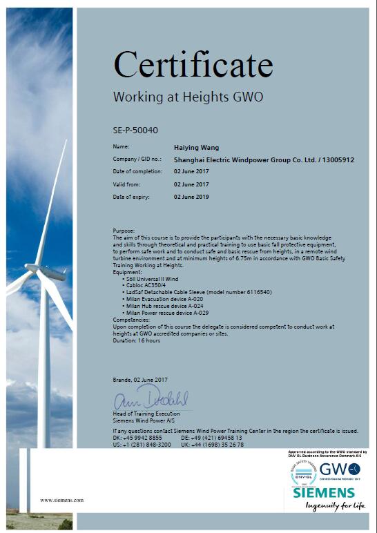 近日,上海电气风电集团的首批安全管理人员通过了全球风能组织(GWO)的“基本安全培训”。该培训分为急救模块、人工搬运模块、消防意识模块、高空作业模块和海上救生模块五部分,分别从模块简介、模块所需资源以及管理和认证等方面针对各模块做出了详细要求。据悉,此次培训人员为国内海上风电首批获得此认证的人员,这意味着风电集团安全管理能力已经得到了全球风电组织的认可,也推动了风电集团海上安全管理能力的建设。