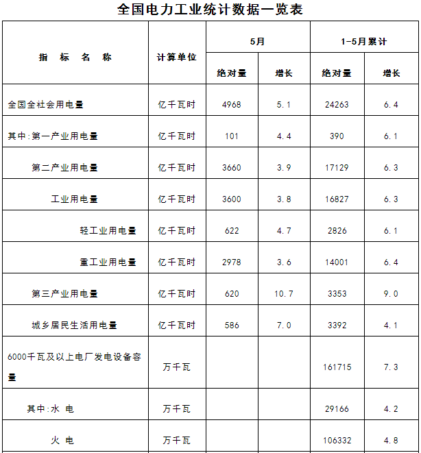 6月16日,国家能源局发布1-5月份全国电力工业统计数据。
