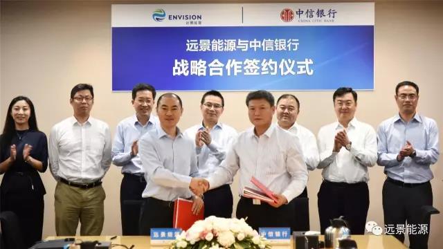 2017年6月16日,中信银行行长孙德顺、副行长杨毓、副行长胡罡偕同十数位总行业务负责人与南京分行行长到访远景,与远景能源签署了百亿规模的战略合作协议。未来中信银行将战略助推远景在智能风机和智慧风场业务发展,以及共同探索在能源互联网金融领域的模式创新,共同构建绿色金融生态。