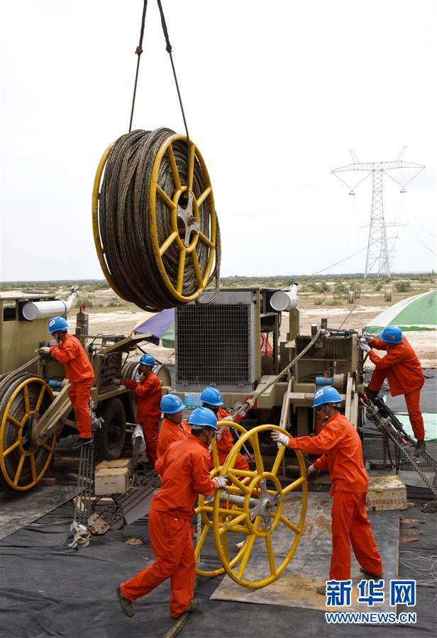在位于新疆奇台县境内的昌吉-古泉±1100千伏特高压输电工程新疆段施工工地,电力工人在吊装牵引线盘(7月12日摄)。从7月12日起,昌吉-古泉±1100千伏特高压直流输电工程新疆段进入放线阶段。该工程全长3300多公里,途经新疆、甘肃、宁夏、陕西、河南、安徽六省区,其中新疆段长约600公里。新华社发