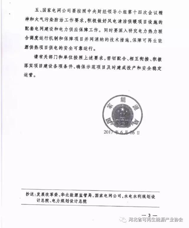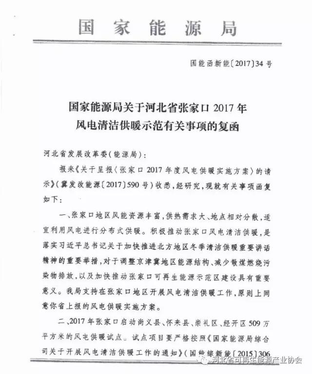 国家能源局批准河北省开展张家口2017年风电清洁供暖示范 共509万㎡(附文件)
