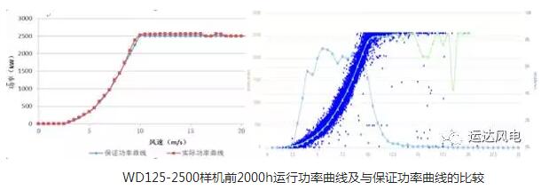 WD125-2500首台样机位于浙江某低风速山地风电场,于2017年5月中旬顺利并网,该机组于2017年7月中旬顺利通过500小时试运行考核。截止2017年8月2日已连续并网运行2000小时,其中连续无故障运行时间MTBF=1416h(注:人工干预次数为0)。期间,轮毂高度平均风速5.7m/s,累计实现发电量1548MW,全风速段的功率曲线考核值K≈103%,时间可利用率99.8%。基于以上运行数据,按该项目可研风频推算,当轮毂高度年均风速5.5m/s(标准空气密度)时,风电场年等效满负荷小时数2600h。