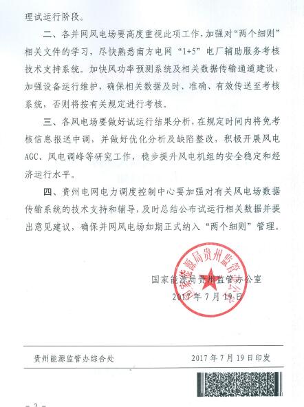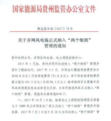 贵州能监办近日发文要求:10月1日起,贵州所有大于30MW的并网风电场将纳入“两个细则”管理并开始结算。以下为文件原文: