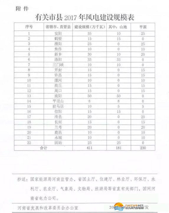 近期,河南省发改委下发了《关于下达2017年风电建设规模的通知》。通知显示,河南省2017年风电建设规模指标共计411万千瓦,其中山地风电181万千瓦,平原风电230万千瓦。以下为原文件: