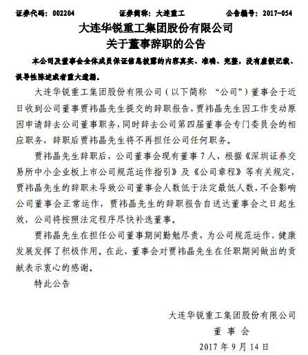 大连重工昨日发布9月14日公告称,公司董事会于近日收到公司董事贾祎晶先生提交的辞职报告,贾祎晶先生因工作变动原因申请辞去公司董事职务,同时辞去公司第四届董事会专门委员会的相应职务,辞职后贾祎晶先生将不再担任公司任何职务。