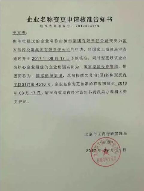 9月21日,北京市工商行政管理局正式下发核准告知书:“神华集团有限责任公司”于9月17日被核准变更为“国家能源投资集团有限责任公司”;核心企业组建的企业集团名称变更为“国家能源投资集团”;集团简称为“国家能源集团”。