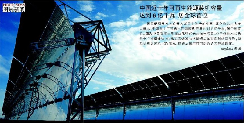 国家能源局有关负责人在日前举行的中国▪德令哈光热大会上表示,中国近十年可再生能源装机容量达到6亿千瓦,居全球首位。图为中国首座大型商业化槽式光热发电项目,位于柴达木盆地的中广核德令哈50兆瓦光热发电项目槽式抛物面集热器阵列。该项目规划装机100兆瓦,建成后每年可节约近6万吨标准煤。cnsphoto供图