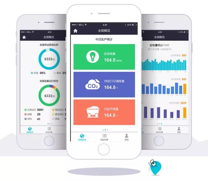 2、统计数据:查看全国各场站的发电量等信息、设备运行状态