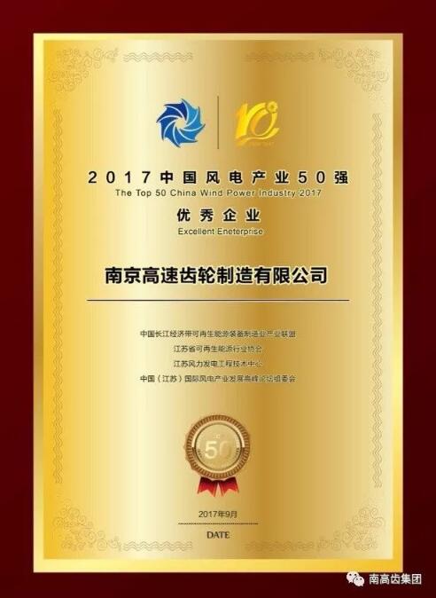 近日,在南京举行的“2017第十届中国(江苏)国际风电产业发展高峰论坛”上,南高齿风电生产基地——南京高速齿轮制造有限公司,荣获2017中国风电产业50强“优秀企业”。该称号是对公司近几年来励精图治,在风电传动设备领域取得的成就的充分肯定。