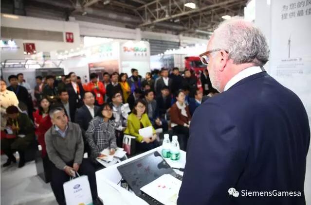 徐如清,SGRE 产品经理,展会期间每天在展位上进行两场演讲,向观众展现我们新机型——G122-2.1 MW的特性。受到了参观者的广泛关注。