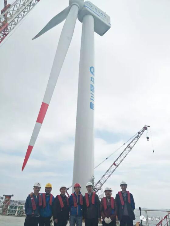 2017年11月10日上午11点38分,在业主与东方风电双方领导的共同见证下,东方风电首台抗台风型5MW海上风电机组在三峡集团福建兴化湾海上风电场完成吊装。东方风电自2009年启动海上风电机组开发,历经样机开发、样机运行、技术升级、商业化运行,东方风电人一步一个脚印,八年磨一剑。该台机组凝结着东方风电人对海上风电的期待和心血,标志着东方 电气与三峡集团携手从长江走向海洋,吹响了东方风电全面进军海上风电的集结号。