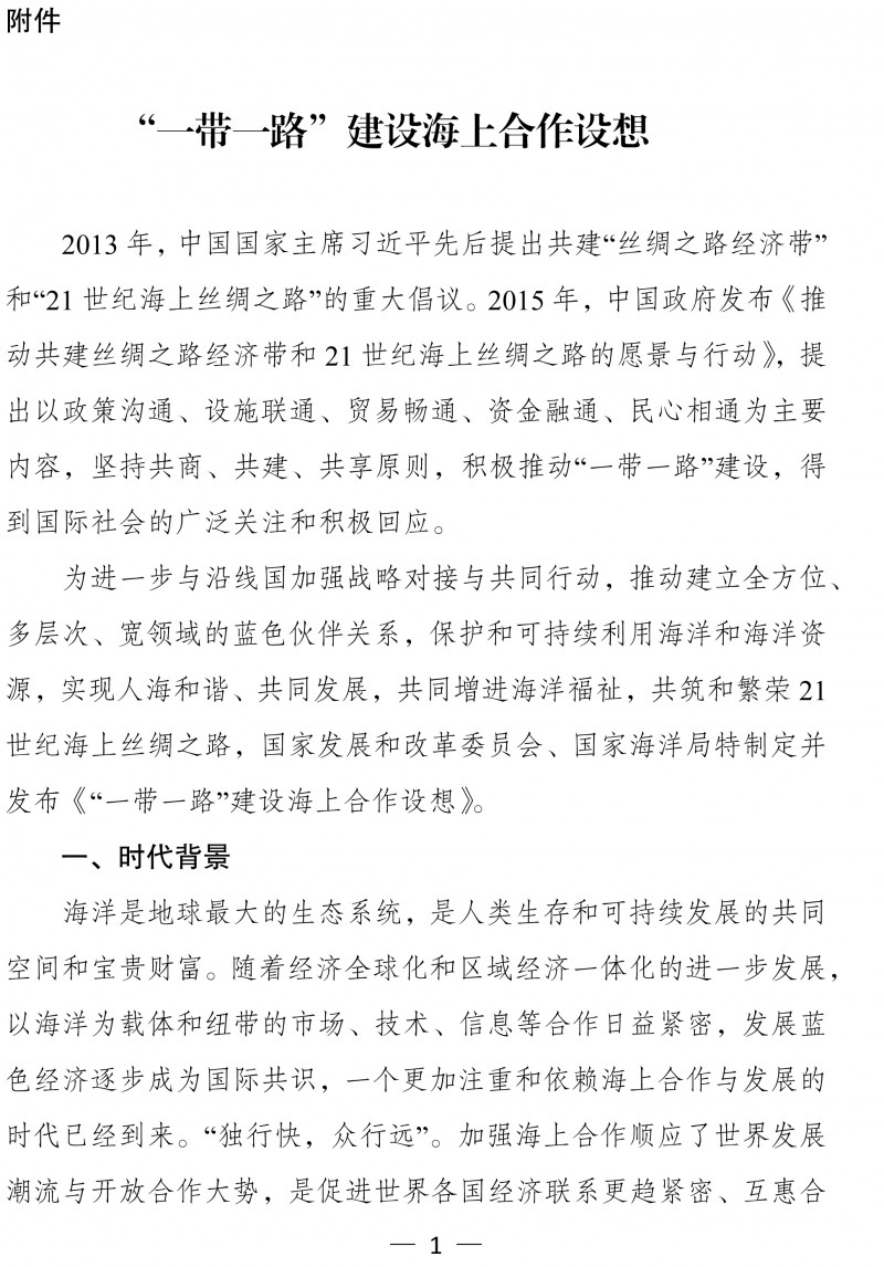 为推进“一带一路”建设,向国际社会阐释共建21世纪海上丝绸之路的核心理念,深化与沿线国家的海上合作,我们编制了《“一带一路”建设海上合作设想》,现予印发实施。