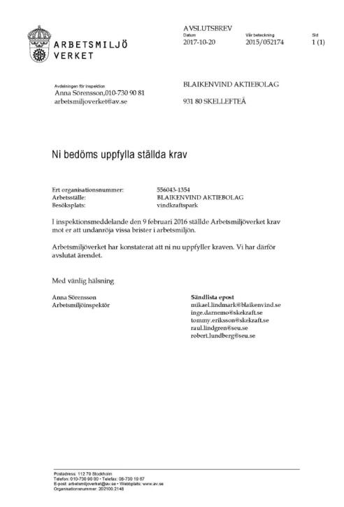 近日,瑞典传回好消息:瑞典工作环境管理署(以下简称“环境署”)通知BlaikenVind,东方风力发电机组满足了所有要求。这意味着之前在Blaiken风场的东方风力发电机组上检查出的所有缺陷和不足已全部完成整改,并满足瑞典环境署要求。