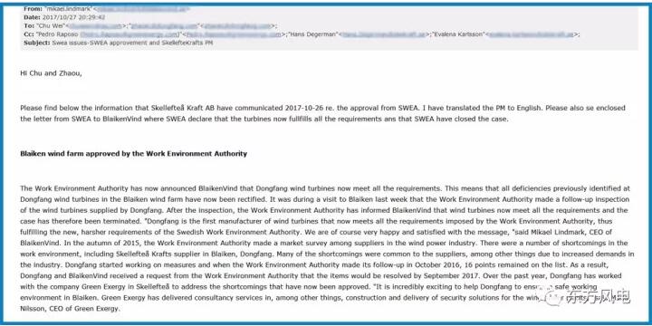 业主方BlaikenVind的CEO,Mikael Lindmark先生对东方风电能够迅速按照瑞典环境署提出的新的更严苛的要求完成整改,并成为第一家达到环境署推行要求的整机供应商表示高度赞许。