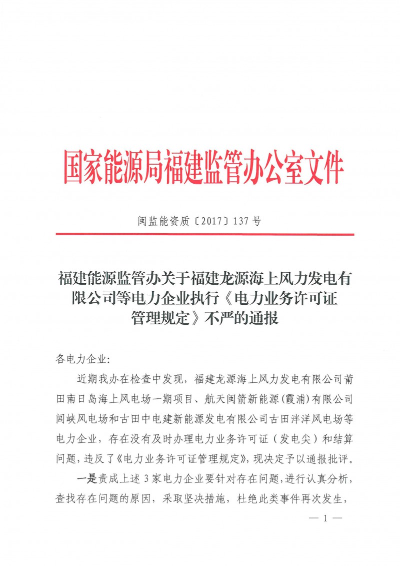 福建能监办近日发布《关于福建龙源海上风力发电有限公司等电力企业执行《电力业务许可证管理规定》不严的通报,针对福建龙源海上风力发电有限公司莆田南日岛海上风电场一期项目、航天闽箭新能源(霞浦)有限公司闾峡风电场和古田中电建新能源发电有限公司古田泮阳风电场等电力企业存在的没有及时办理电力业务许可证(发电尖)和结算问题予以通报批评。以下为通报原文: