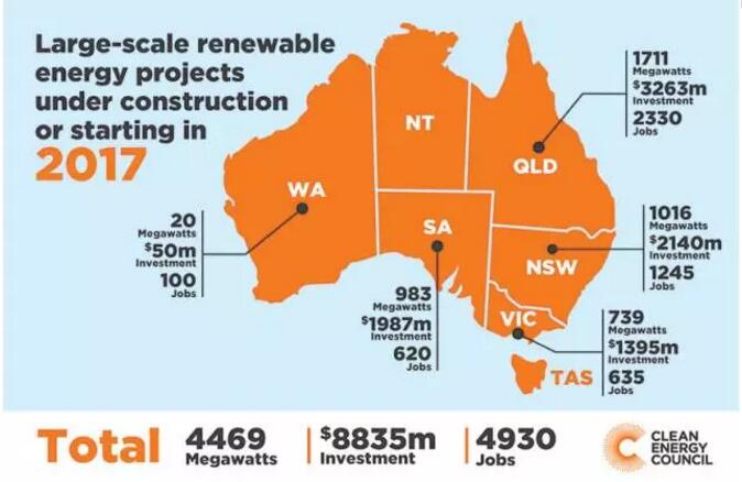 澳大利亚可再生能源投资持续强劲上升,2017年或将成为破纪录的增长年。官方数据显示,今年在建或已完工能源项目数至少为43个,预计将带来前所未及的88亿澳元投资,总发电量将超过4469兆瓦,创造就业岗位4930个。
