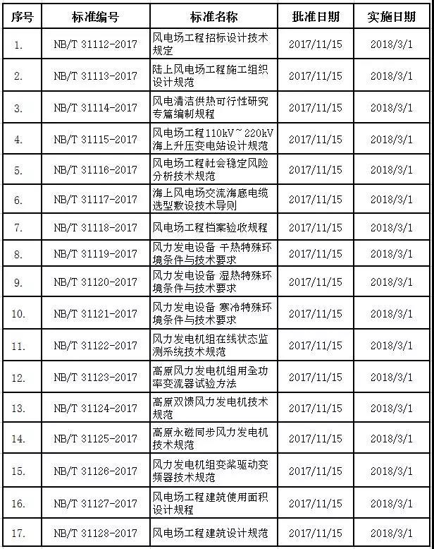 国家能源局近日发布2017年第10号公告,批准了《风电场工程招标设计技术规定》等204项行业标准,其中涉及17项风电标准。