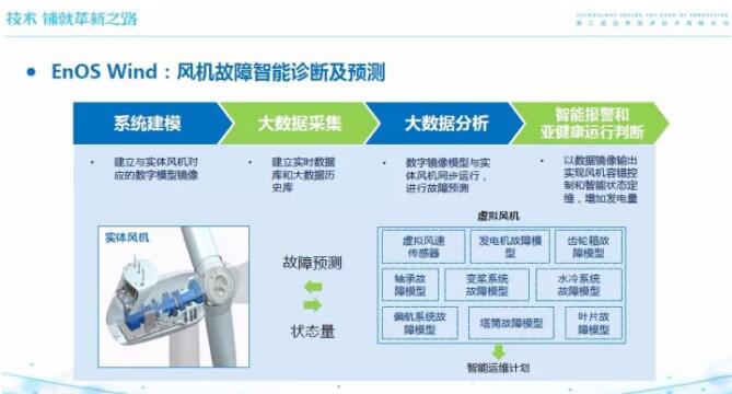 进一步地,远景采用传感器群监测方式,通过对大部件的精确建模,采用有限的传感器的状态组合,从空间和时间尺度精确地诊断和预测各部件故障。进一步提升风机可靠性,并降低风机运维成本。