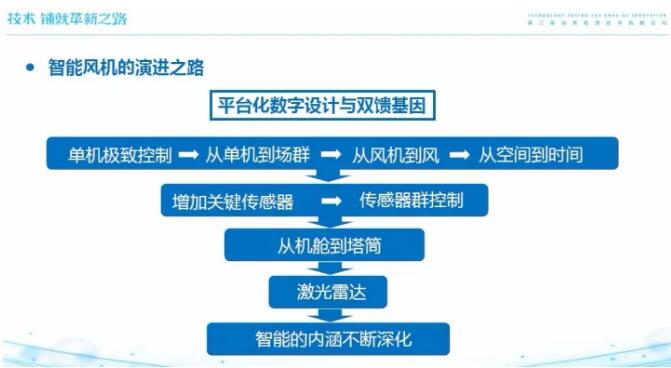 在12月1日远景主办的“第三届远景能源技术高峰论坛上”,远景能源智能风机解决方案负责人张轩向到场的客户分享了远景在智能风机一代代演进的技术突破层面所做的积累。他提到,远景是首个提出智能风机概念的公司,自此之后,远景能源全球研发团队不断赋予智能风机新内涵,风机的发电量和可靠性得到了持续的快速提升。