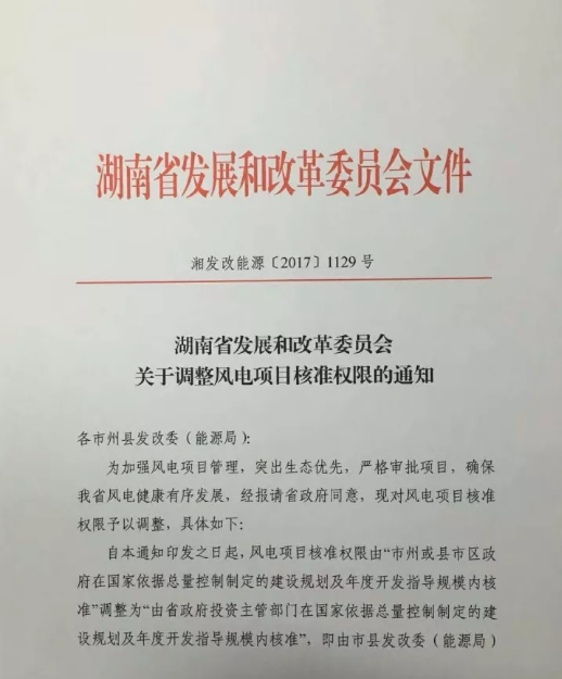 湖南省发改委调整风电项目核准权限:由市县发改委核准调整为省发改委(能源局)核准(附文件)
